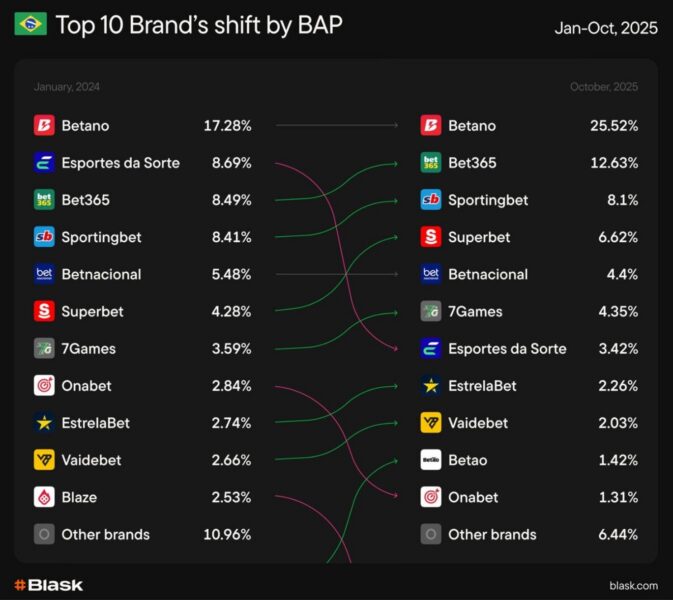 Entre enero y octubre de 2025, y comparado con enero de 2024, Betano amplió su liderazgo de 17,28% a 25,52%, y bet365 creció de 8,49% a 12,63% en Brasil, de acuerdo con el BAP medido por Blask.